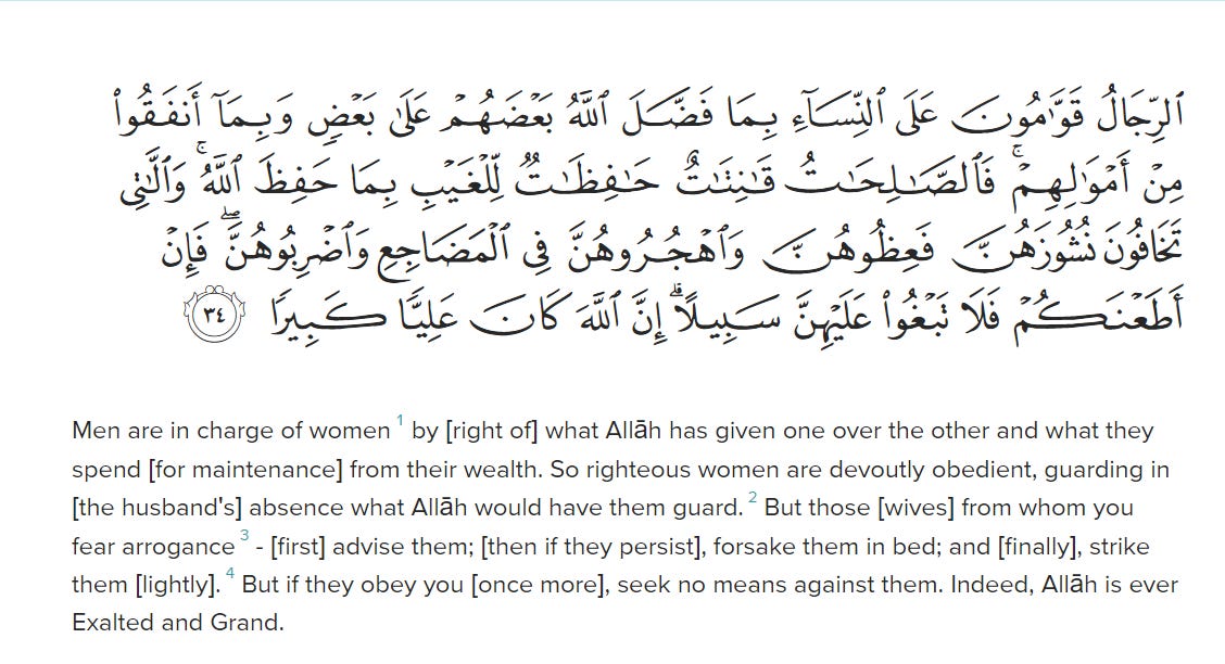 " আর যাদের (স্ত্রীদের) মধ্যে কোন অবাধ্যতা খুঁজে পাও তাদের সদুপদেশ দাও, তাদের শয্যা ত্যাগ কর এবং প্রহার কর।" - সুরা নিসা আয়াত ৩৪ " Surah Nisa